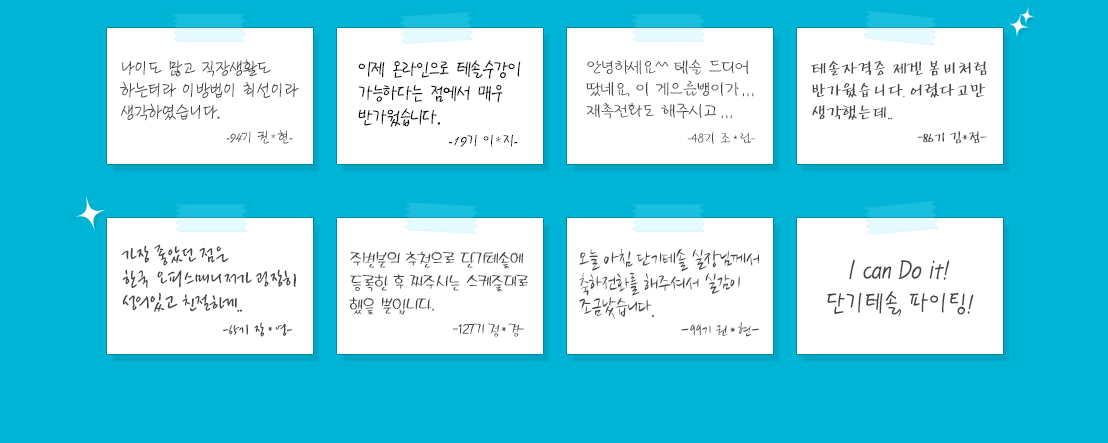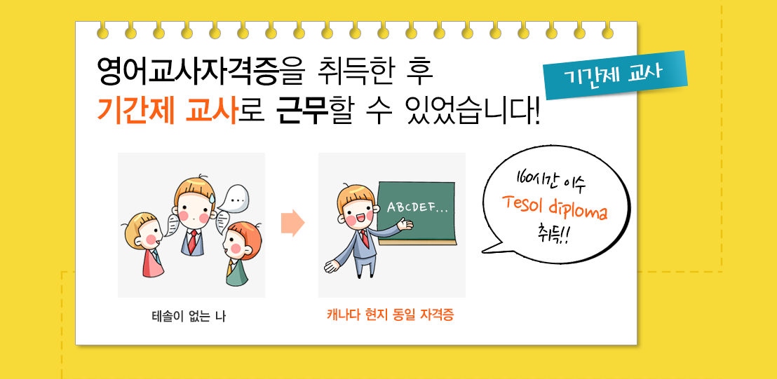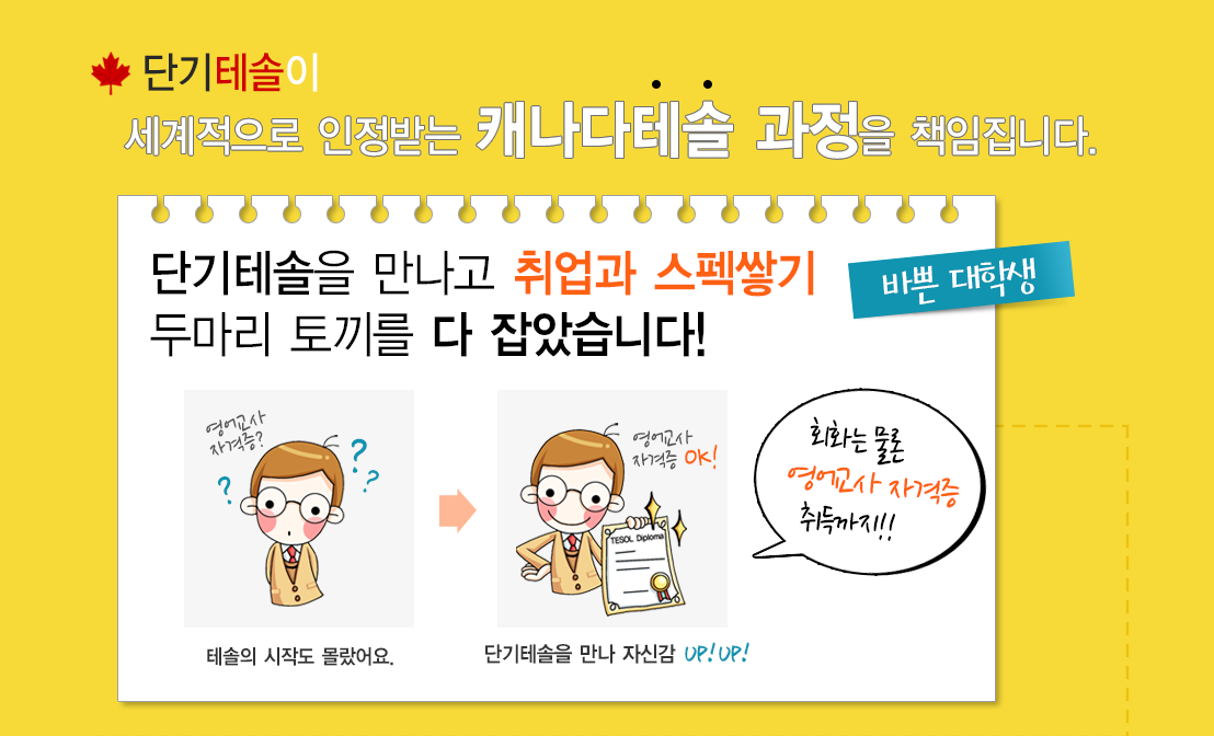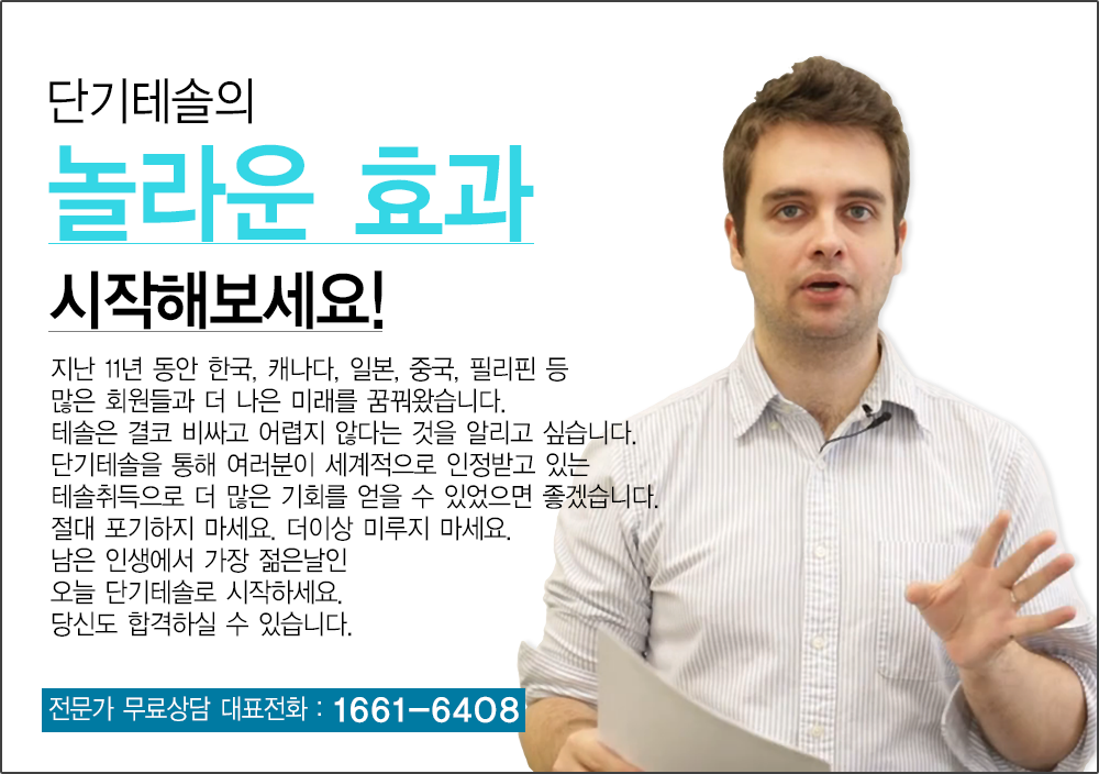 - 6주 만에 합격이 가능합니다. 단기테솔은 철저한 1:1담임선생님 제도를 통해 시작부터 합격시까지 철저한 관리를 해드리고 있습니다. 직장인 수강생분들이 많다보니 개인별 학습 수준과 시간여건에 따라 8주~10주까지 걸리기도 합니다.