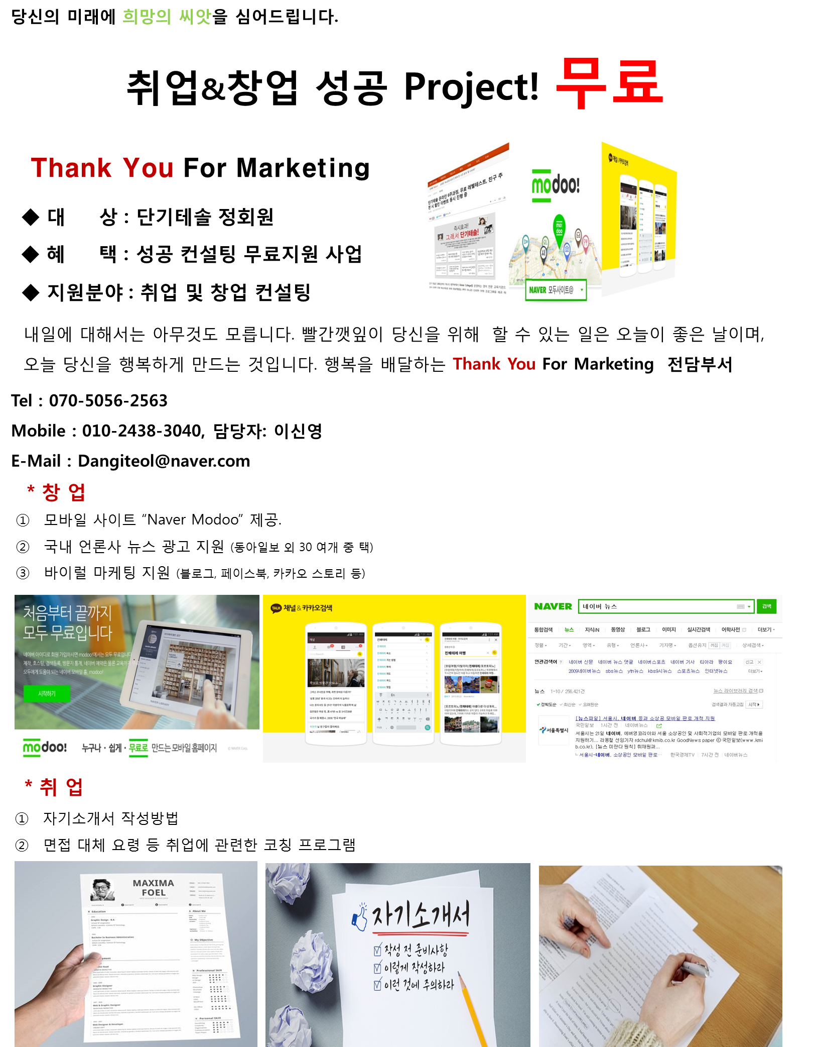 홈 > 고객센터 > 공지사항 취업자와 창업자를 위한 성공 무료 컨설팅 지원 이벤트 글쓴이 : 단기테솔 작성일 : 15.07.28 조회수 : 2,078 이전글 2015년 7월 셋째주 디플로마 발부 안내 입니다. 다음글 8월 카드 무이자 할부 이벤트 안내 입니다.