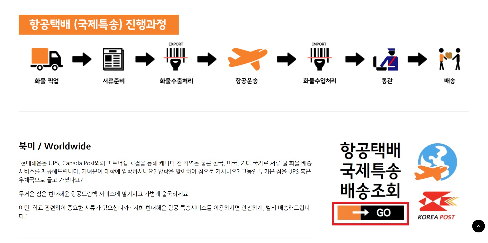 ② [ 북미 / Worldwide ] 우측에 있는 (항공택배,국제특송.배송조회) 로 이동합니다
